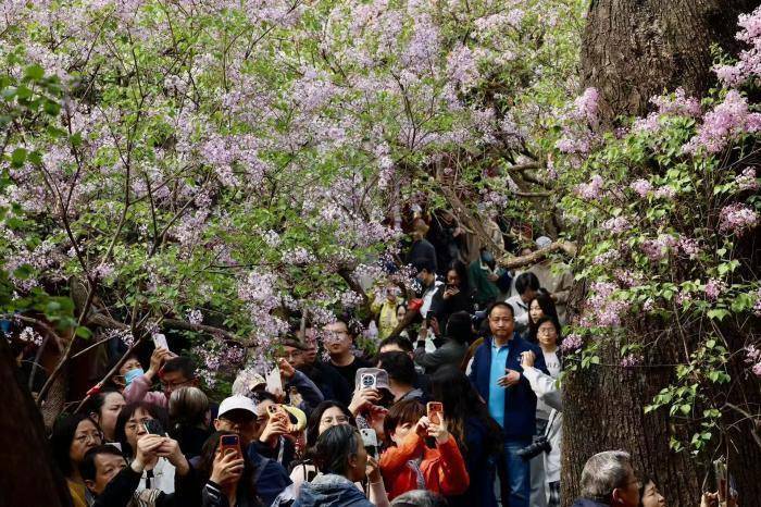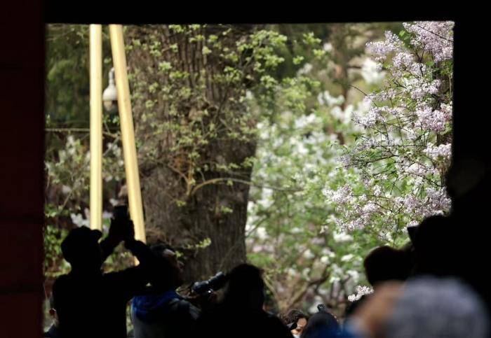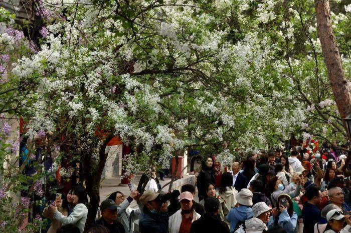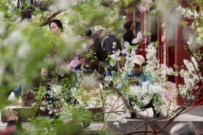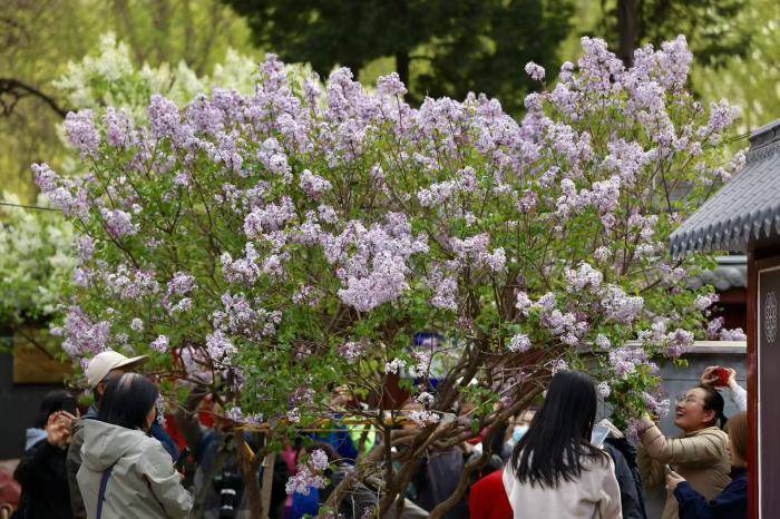 4月2日,北京西城区法源寺丁香进入盛花期,紫白繁花缀满枝头,幽香弥漫寺院,迎来大批市民游客赏花拍照。